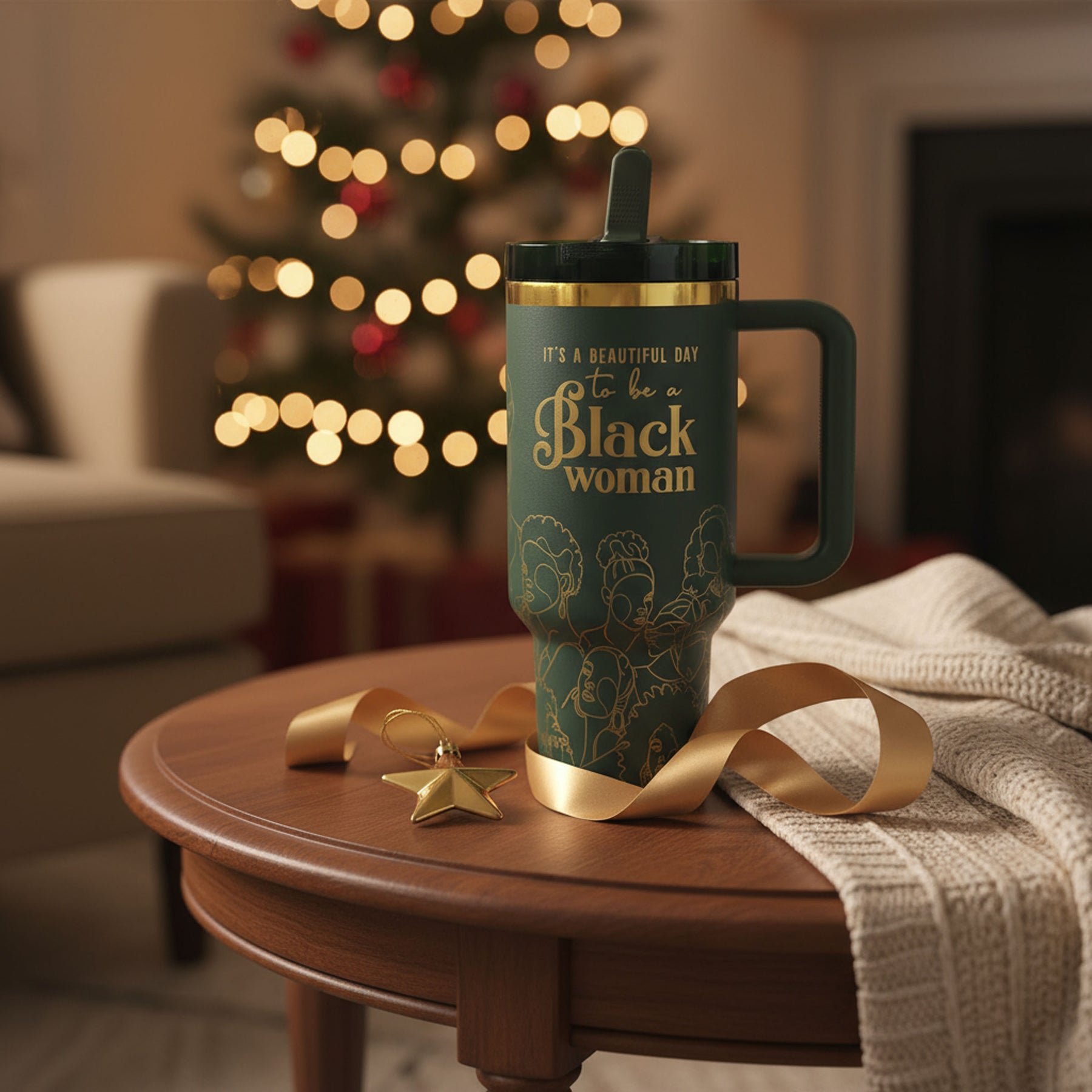 • Signature Affirmation: “It’s a Beautiful Day to be a Black Woman”—boldly printed on both sides illuminated by Black art.